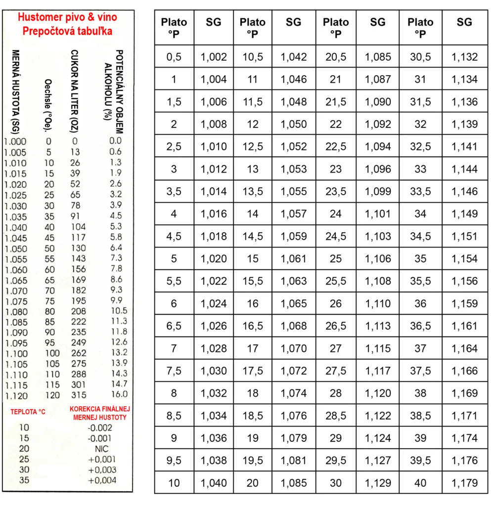 Na stiahnutie: Prepočtová tabuľka Hustomer Pivo & Víno , Prepočet SG – Plato °P